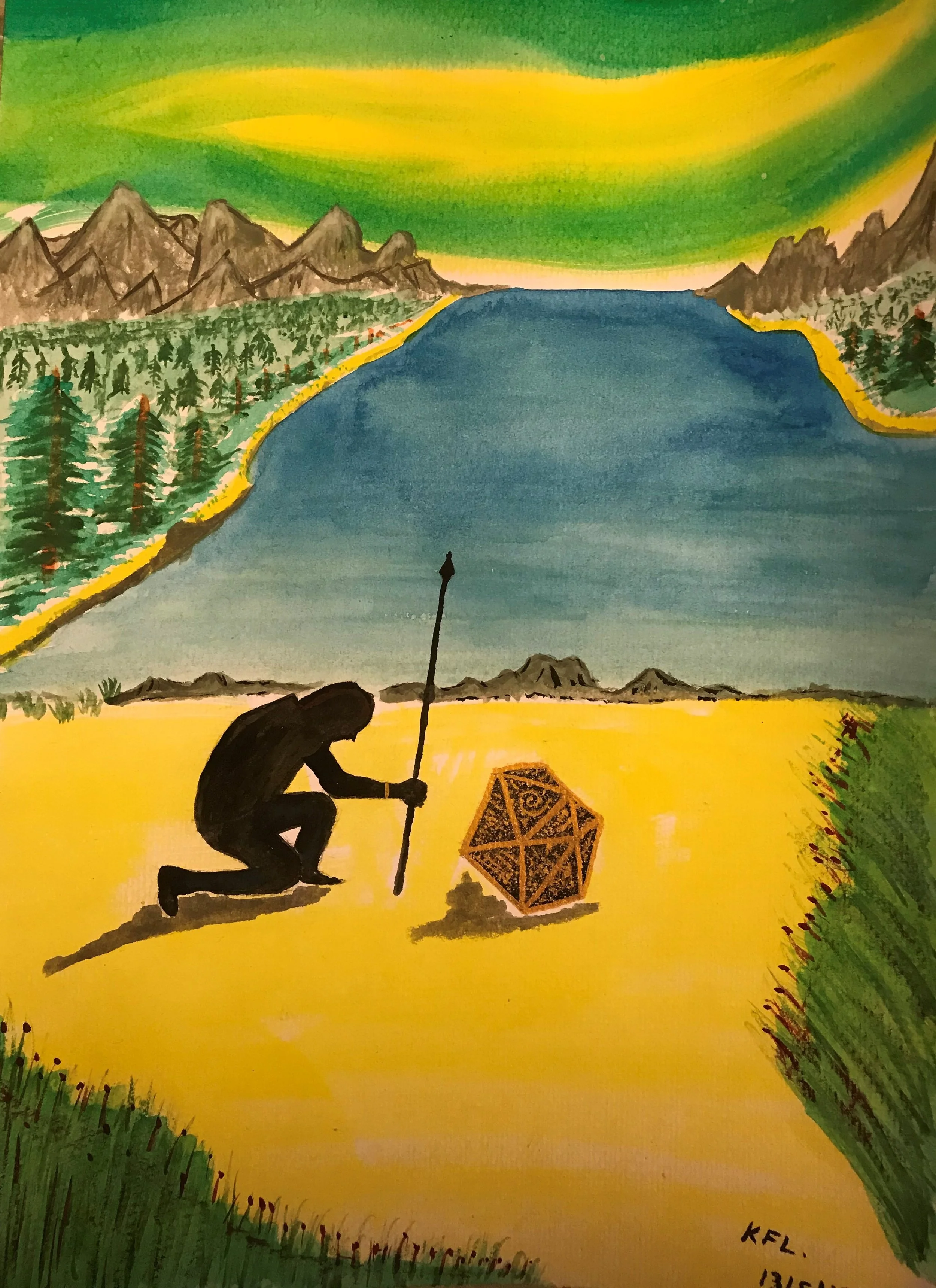 In the future, and in the event of some global cataclysm, we can imagine that some human would be wondering in the wilderness. They would be a survivor from a pocket community, exploring the landscape that remained and was in the process of renewing itself. Such a human, would be concerned with day to day survival, but also thinking about how they could rebuild the human future, so that we could once again move from a hunter-gatherer to an agricultural-farming community, where free time was available to study nature, science and the world at large and learn how to build a better civilized society. The painting below, imagines such a scene, where the Apkallu artefact is found on a remote beach, and its engraved knowledge looked upon with curiosity and awe.
