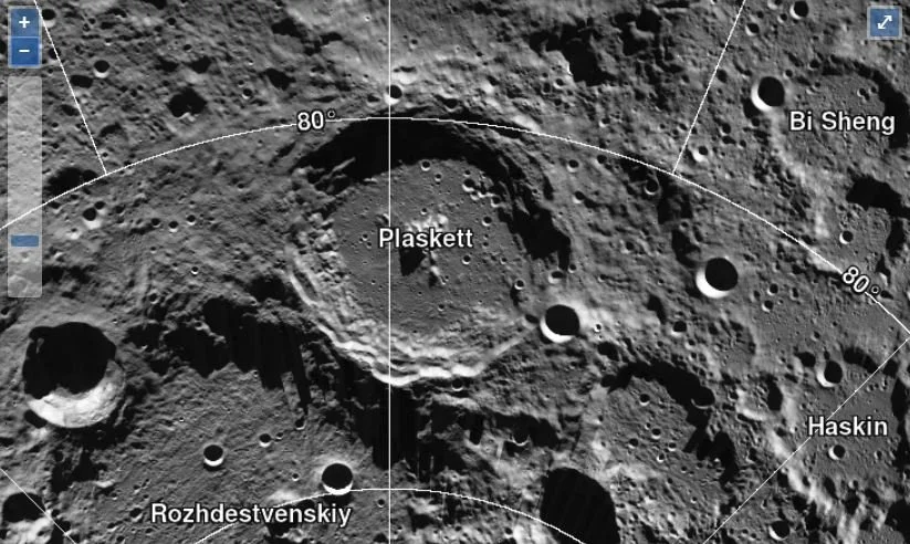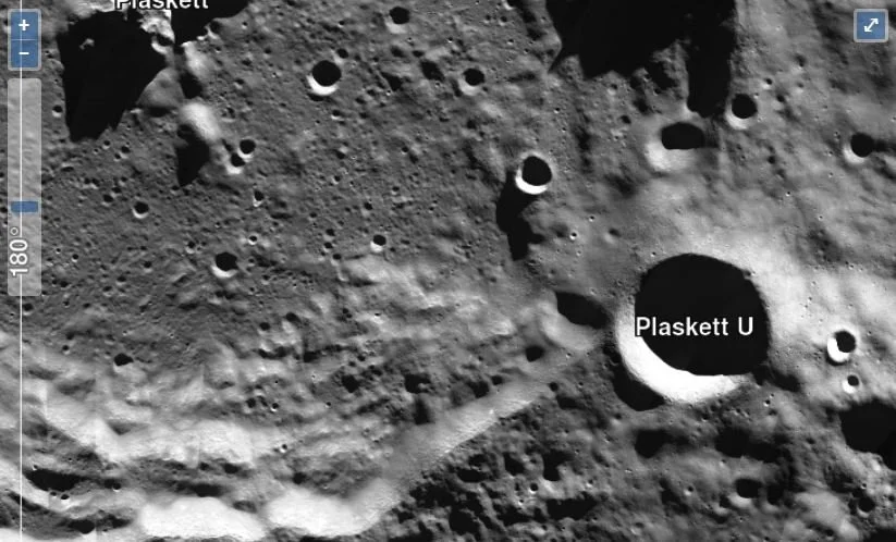 Next we turn to Plaskett Crater which is located on the Northern hemisphere and on the far side of the Moon, approximately several hundred miles South of the Lunar North Pole. Its centre located at 82.1 degrees North, 174.3 degrees East. It has several rims to the crater and at its full extent has a diameter of over 100 km. The crater is as big as a large city like London. Yet, due to its location, no humans have ever landed there and that was certainly the case for Project Apollo.