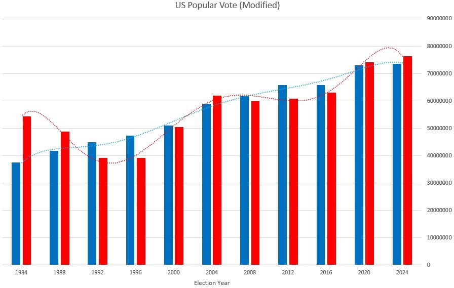 Note also that the population of the United States in these three years is estimated to have been around 345.4 million (2024), 329.5 million (2020) and 323.1 million (2016). This means that the actual percentage of people that voted for these two main parties (some would have voted for independents, typically <2% in 2024) was ~43.5% (2024), ~47.2% (2020), ~39.9% (2016). Indeed, we can in fact look back over the last two decades back to 1984 (President Reagan) and see how the proportion of the electorate voted for either Democrat or Republican and immediately we see that 2020 stands out as an anomalous year compared to all other years. This is shown in the data plotted below.