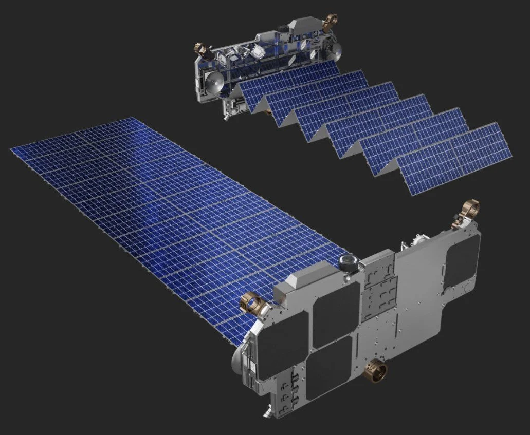 Each Starlink satellite carries a Hall-effect thruster powered by Krypton to allow them to raise their orbit and also de-orbit at end of life. They each carry four phased array antennas and two parabolic antennas to provide increased capacity.