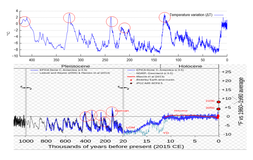 There have been other interglacial periods that have resulted in global temperatures being either equivalent or above the average today, and the data shows temperature spikes of periods at around 200,000 years, 220,000 years, 240,000 years, 330,000 years and 410,000 years. Each of these interglacial periods will typically last at least 10,000 years.