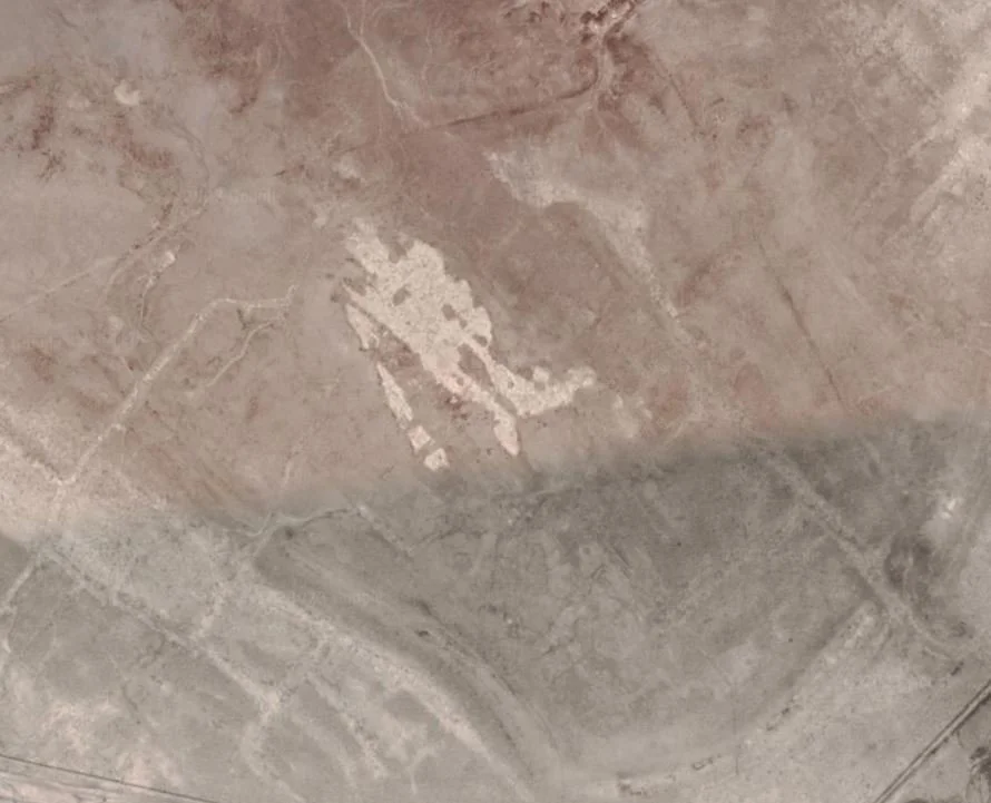 If you look at around 6 O’Clock on the image there is a curious looking marking on the ground that looks almost like a geoglyph. A geoglyph is a ground feature that often appears in South America or even in parts of Britain associated with ancient cultures produced by durable elements on the landscape such as stone, gravel and earth. Let us zoom in a little closer: