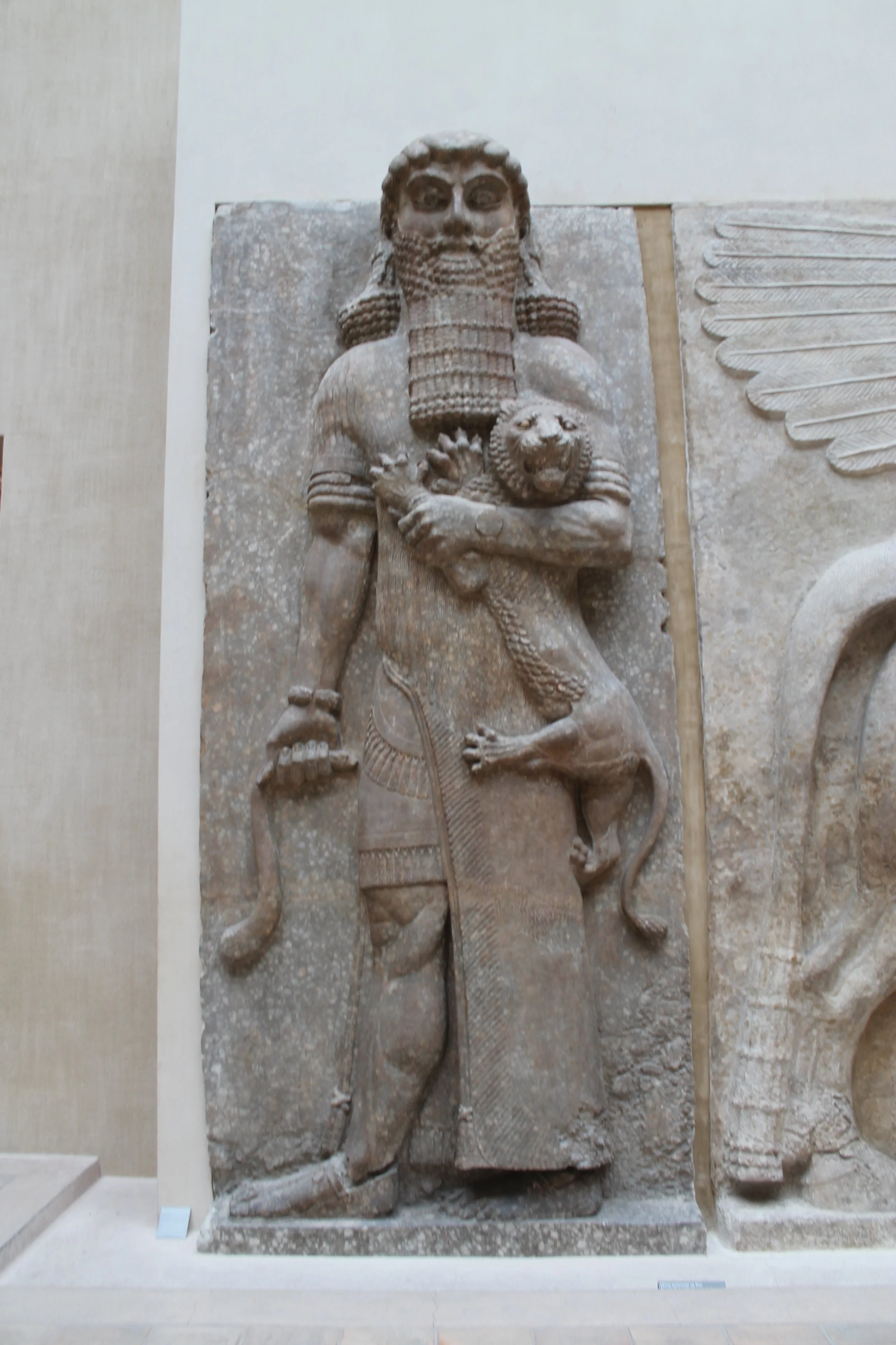 The image below depicts an original sculpture of Gilgamesh that is located at the Louvre in Parsis which I took when I was last visiting. Note how Gilgamesh is always depicted holing a Lion in his left hand and a snake in his right hand. Gilgamesh was not a small man but a giant man, perhaps 8 - 9 ft tall. The legend has him as part human and part god.