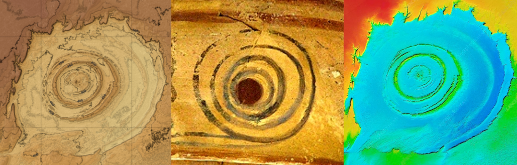 For any comparison between the pottery and the geographic site of the Richat structure (as a claimed City of Atlantis) to be feasible there are several features that must be present in both. The first is a central offset region to represent a city centre, and this is present in both, although more prominent in the pottery. The second is the requirement from Plato that there would be three rings of water and two rings of land. This certainly appears present in the Richat structure, and although there are four rings in the pottery, it is perhaps not so clear what they might represent. But if such a city did exist, and the memory of it was passed down over time, could perhaps it have been preserved in the legacy of the Minoan pottery and other cultures?